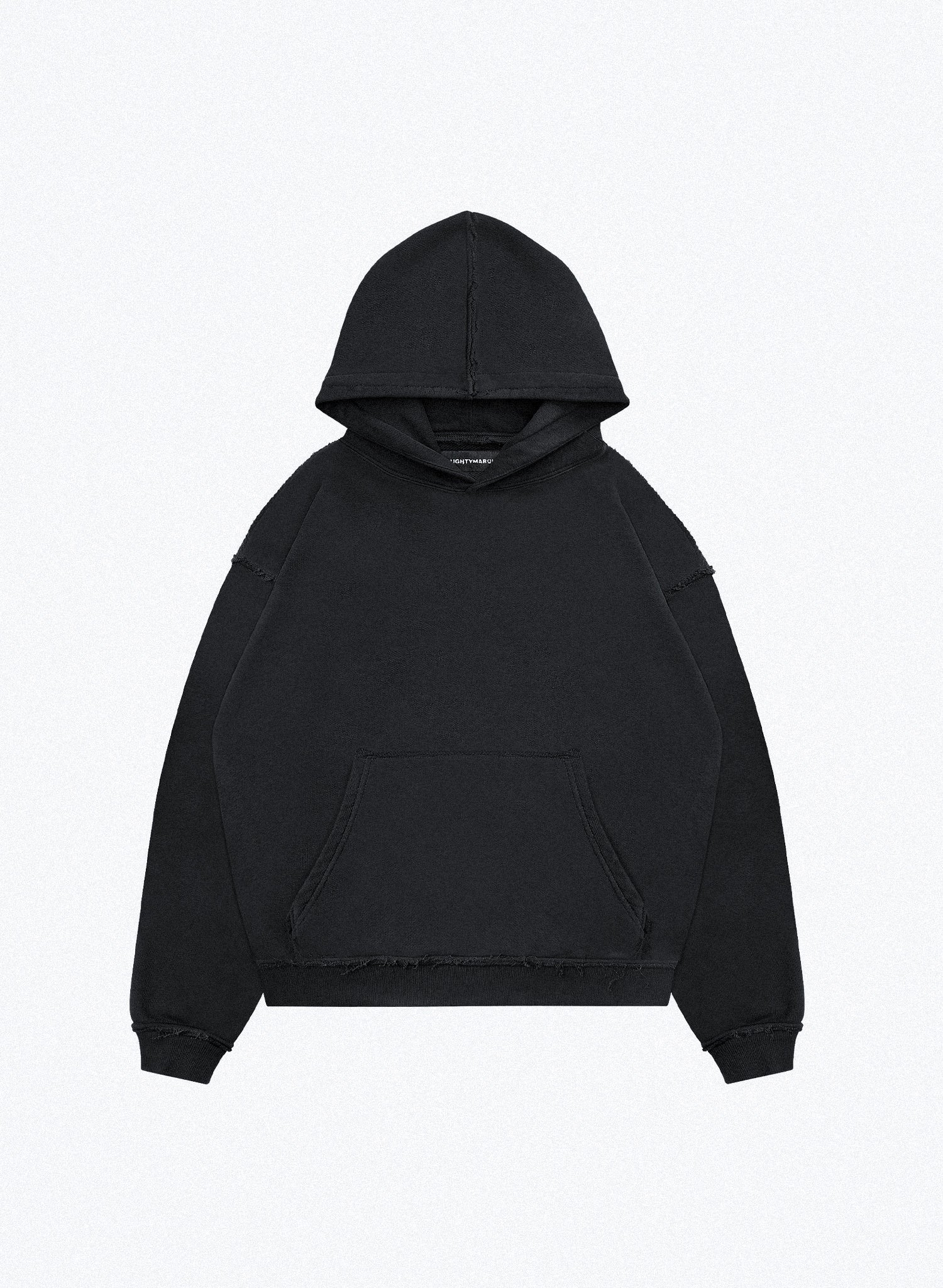 "Ordinare" Black Hoodie. Sewn with raw reverse seams. Loop knit fabric (not combed) (400g). Made in Poland. Unisex.